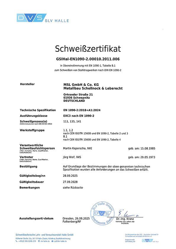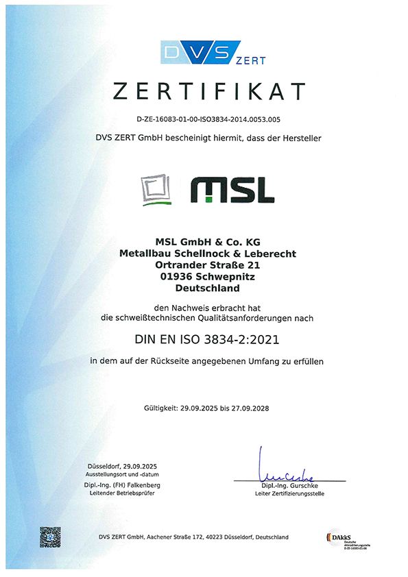 Schweißfachbetrieb nach DIN EN 1090-1, DIN EN 1090-2 und ISO 9001:2015